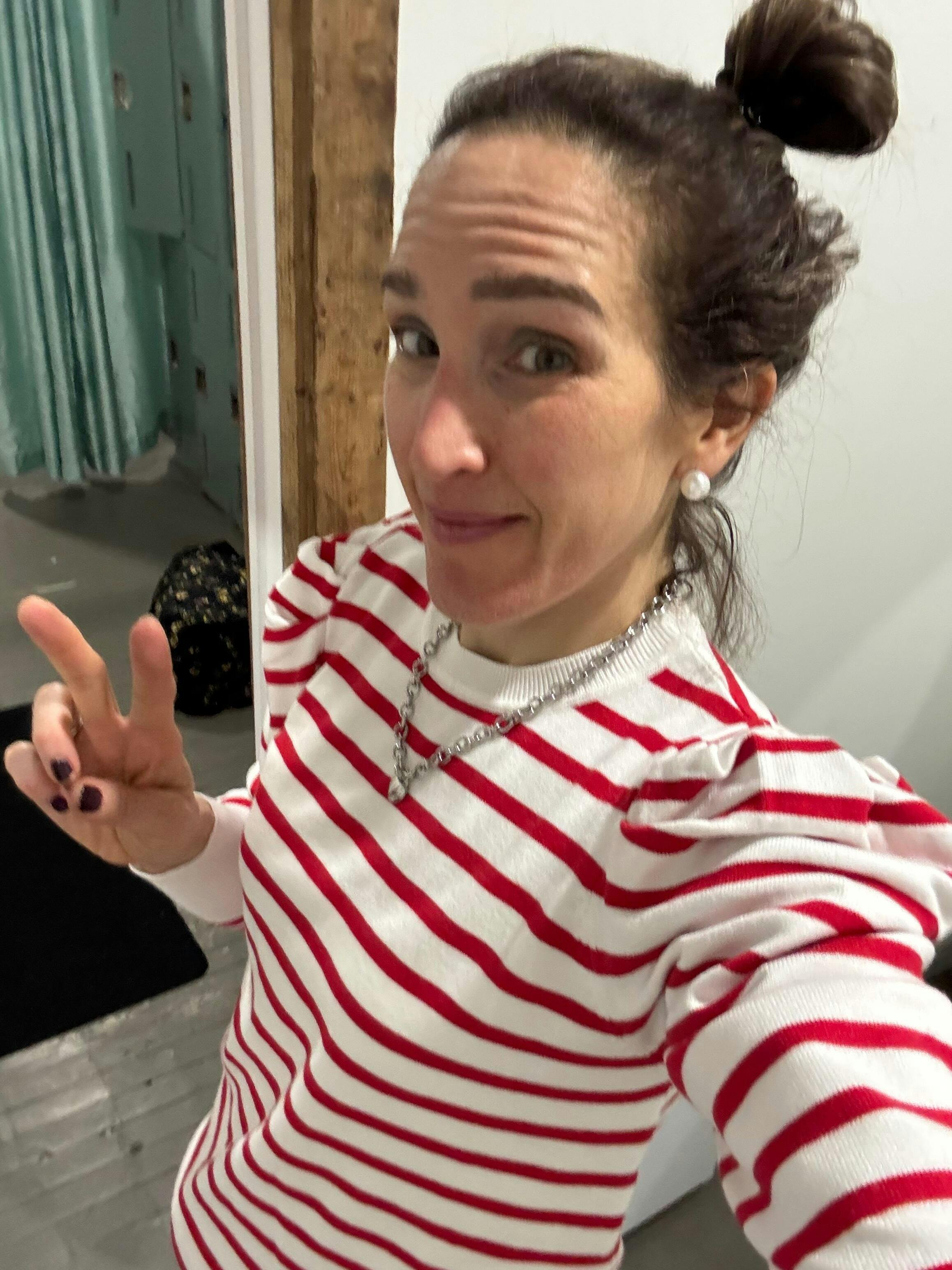 The Willow Striped Sweater is a long sleeve crew neck sweater that features a thin stripe throughout. It features a small puff shoulder, and a large ribbed wrist cuff.